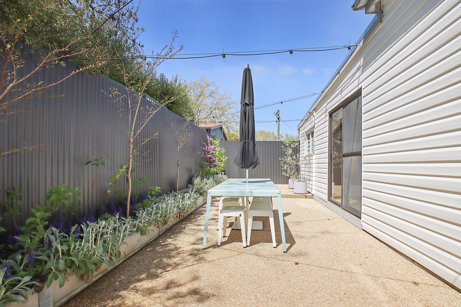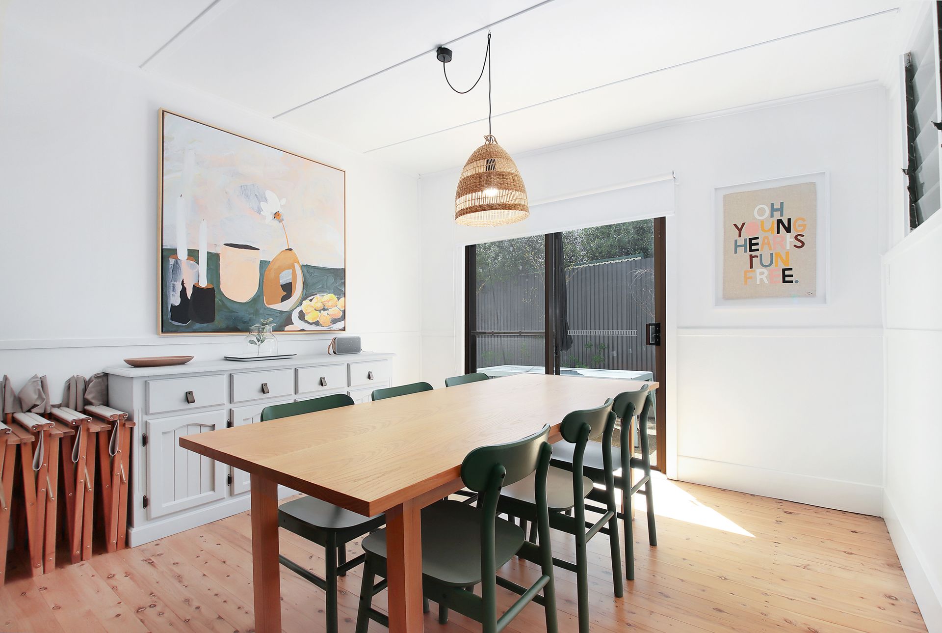 The dining room seats 6 and opens to a charming patio with an additional outdoor dining area under festoon lights. Perfect for meals or evening drinks. The well-equipped kitchen features a large Smeg oven, ideal for home-cooked meals. There is no dishwasher, inviting a little old-fashioned washing-up fun! Out the back the original mudroom/lean-to houses the laundry and separate toilet.